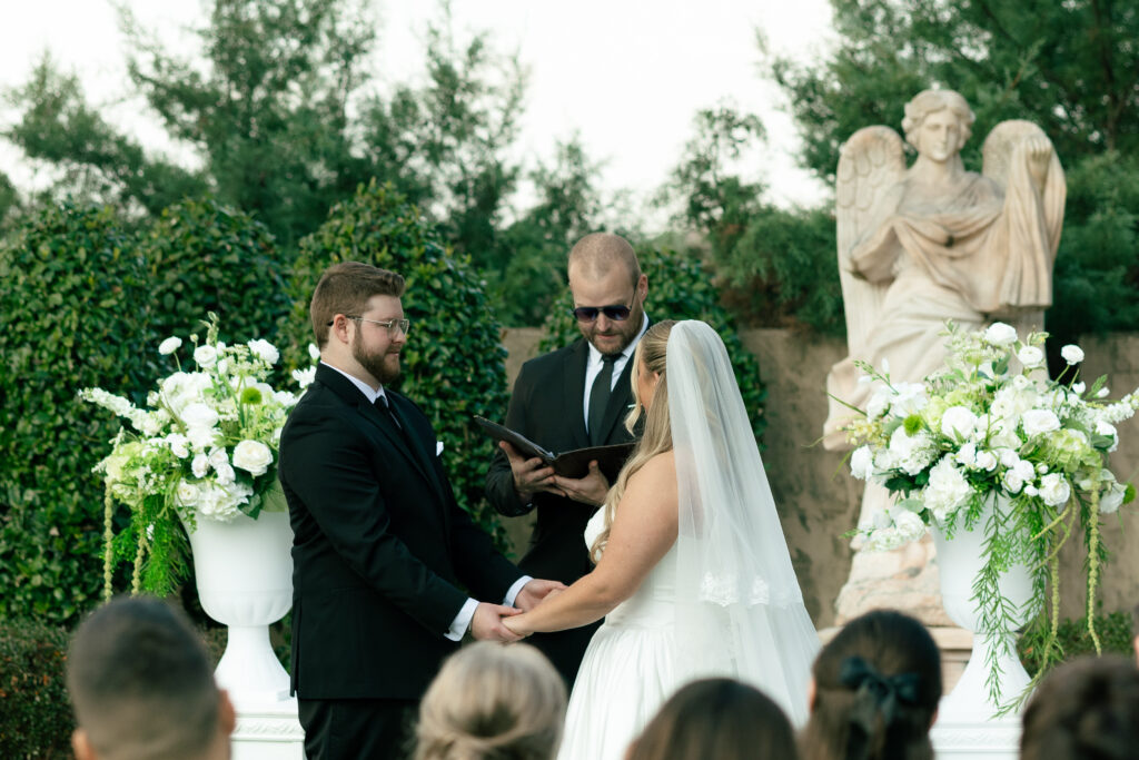 The contrast of the guests’ attire against the bride’s white gown was breathtaking and added to the editorial feel of the celebration. White and cream floral arrangements were placed throughout the courtyard, beautifully standing out against the lush green lawn and historic architecture of Fountainview Mansion.